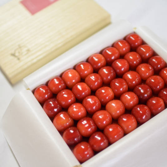 中川果樹園のこだわりは樹上完熟してからの収穫。樹上完熟することで、さくらんぼ本来の凝縮された甘みを味わえます。佐藤錦は糖度が高く、果汁も多いのが特徴です。樹上でしっかり完熟してから収穫していますので、濃厚な甘みとほのかな酸味を味わうことが出来ます。また、樹上完熟を見極めて早朝に収穫したさくらんぼをその日のうちに発送致します。佐藤錦の中でも最高級な粒のみを厳選し、一粒一粒丁寧に綺麗に並べ、中川果樹園オリジナル特撰桐箱に詰めてお送り致します。綺麗に並べられたさくらんぼはまるで宝石箱のようです。大切な方への初夏の贈り物にぴったりの商品です。