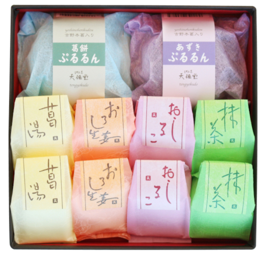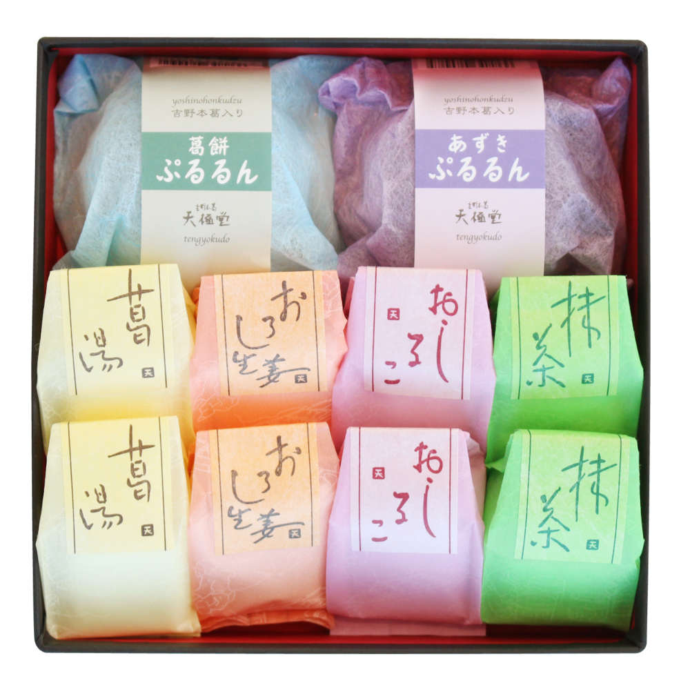 【内容量】ぷるるん2個(あずき1個、葛餅1個)、葛湯8個(葛、抹茶、おしるこ、おろし生姜各2個)