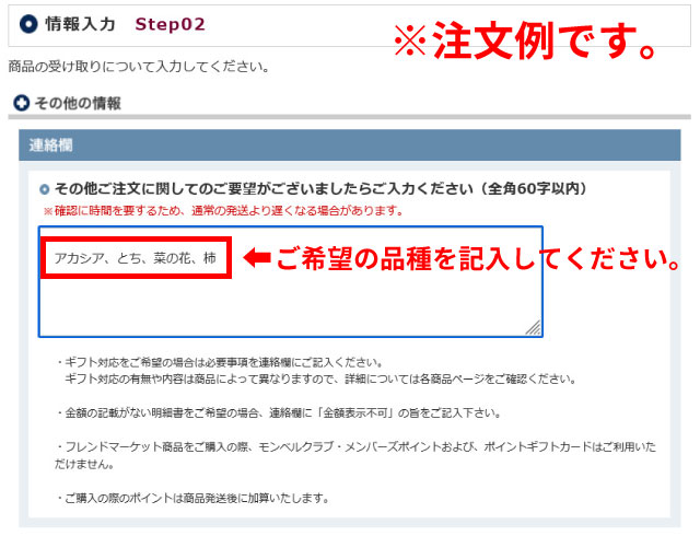 ご注文画面の「連絡欄」に、ご希望の6種をご記入ください。詳細情報に注文例を表示しています。