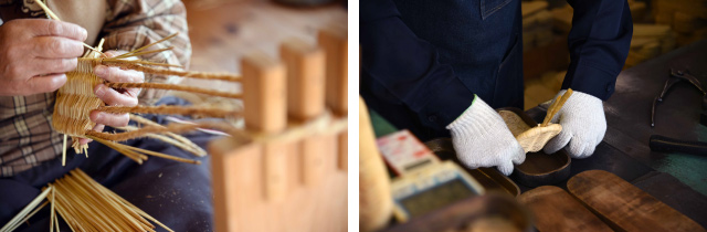 軽部草履の竹皮草履は熟練の職人が丁寧に選別した竹皮を手作業で編み込んでいます。一足の編み上げにかかる時間はおよそ一時間半、とても根気のいる作業です。編み上げから製品加工まで、手編みの草履を一貫して製造しています。