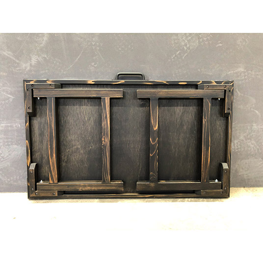 折り畳み脚には既製の金具を使わず、杉材を使用。古材と相性の良いオイルステイン塗料で着色し、全体をクリアウレタン塗装で仕上げています。