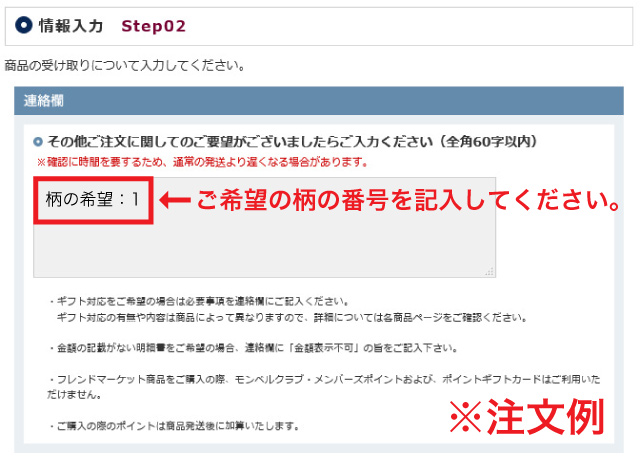 ご注文画面の「連絡欄」に、ご希望の柄をご記入ください。