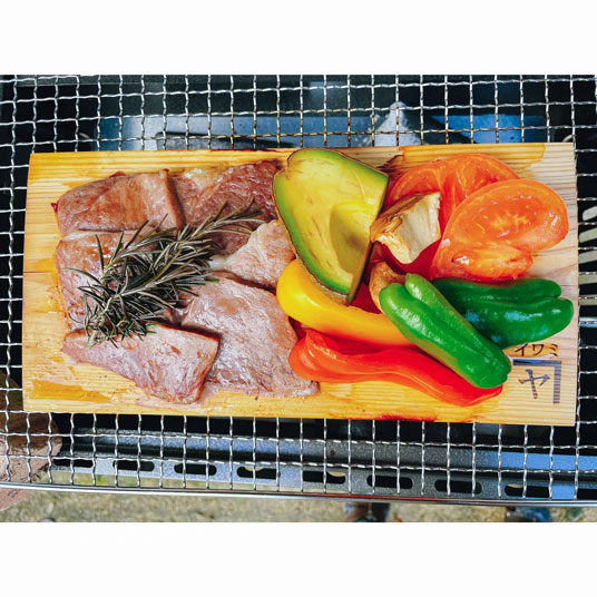 木の板の上に食材を乗せて焼く、アメリカで定番のBBQスタイル「ウッドプランク」が楽しめるスギのプレートです。濡らした木の上で肉や魚を焼くことで燻製のような風味に仕上がります。