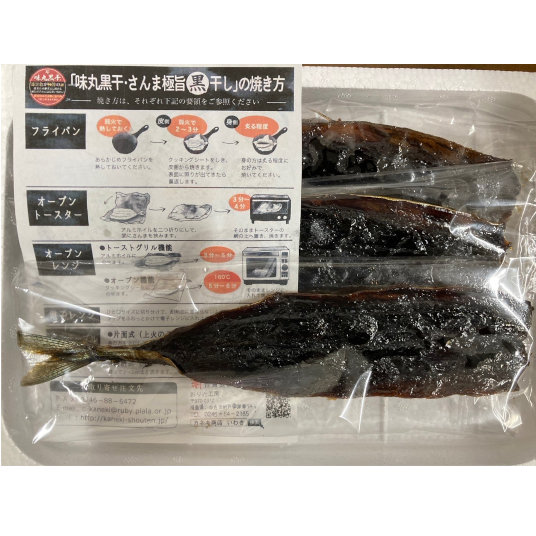 創業以来70年、継ぎ足し続ける秘伝のたれに漬け込んだ漆黒のサンマの、みりんを使わないみりん干し「味丸黒干(R)」です。調味料は砂糖(洗双糖)と塩の2つのみで、しょう油、みりんをはじめ、化学調味料、保存料、着色料、酸化防止剤、つや出し材は一切使用していません。