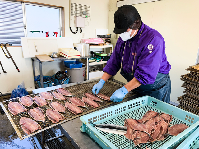 カネキ商店のみりんを使わないみりん干し「味丸黒干」®は、厳選した魚の原料を使用しています。また、魚の頭部カットから中骨取り、開くまでの工程を除き、全て手作業で作っています。