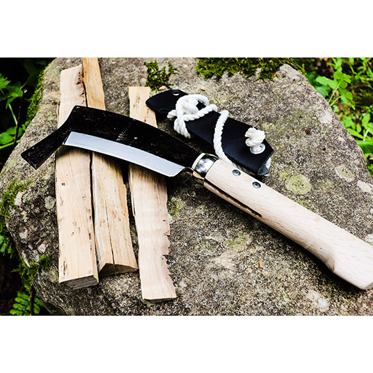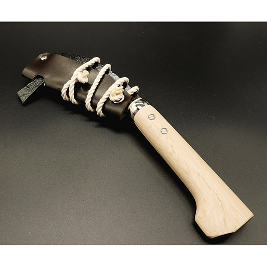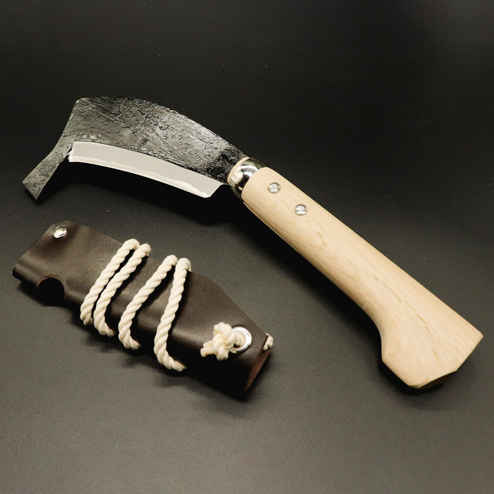 本来、山仕事や林業で使う大型のものを、より小さくすることで携帯性を向上させ、キャンプなどで手軽に使えるようにしました。刃先全体の緩やかなカーブが対象物を逃さずにしっかりと捉えるので、作業をより効率的に行うことができます。しっかりと鍛造された刃は粘さと耐久性を備え、刃こぼれしにくい、強靱(きょうじん)な仕上がりとなっています。