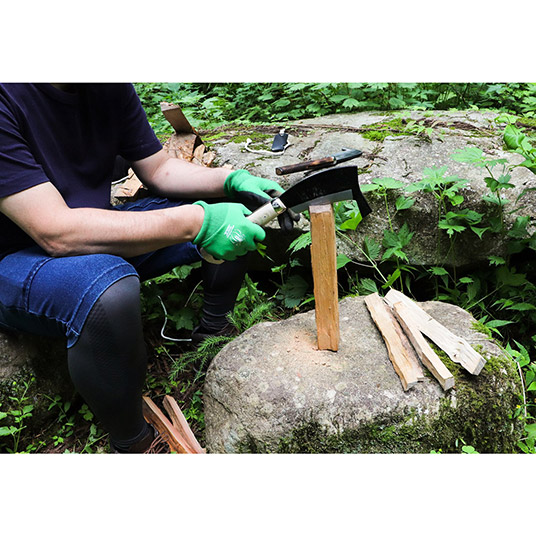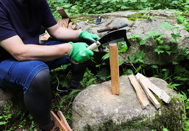 まきを大きな石の上に立てます。鉈を斜めから軽く刺し、複数回石に叩きつけることで、まきが割れていきます。