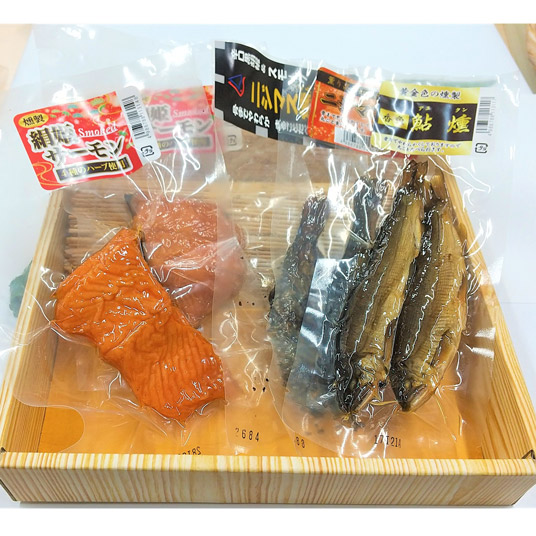 鮎と虹鱒、そして愛知県ブランド魚「絹姫サーモン」の燻製詰め合わせです。新鮮な魚を丁寧に下処理した後、さくらチップで燻しました。独自の製法を用いる事で、頭から骨まで丸ごと食べられるよう柔らかく仕上げました。魚の旨味が凝縮され、燻製の匂いが食欲をそそります。