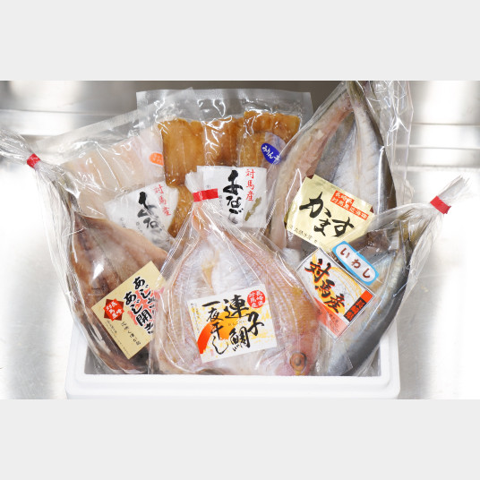 【内容量】アジ2枚入り、カマス2枚入り、レンコ鯛1枚入り、アナゴ200g、アナゴみりん200g、イワシミリン2枚入り