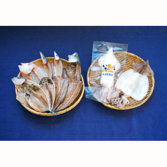 【内容量】剣先イカ刺身用1枚 スルメイカ一夜干し1枚 アジ開き2枚 カマス開き2枚 レンコ鯛開き1枚 塩サバ開き1枚 イサキ開き1枚 カマスみりん干し2枚