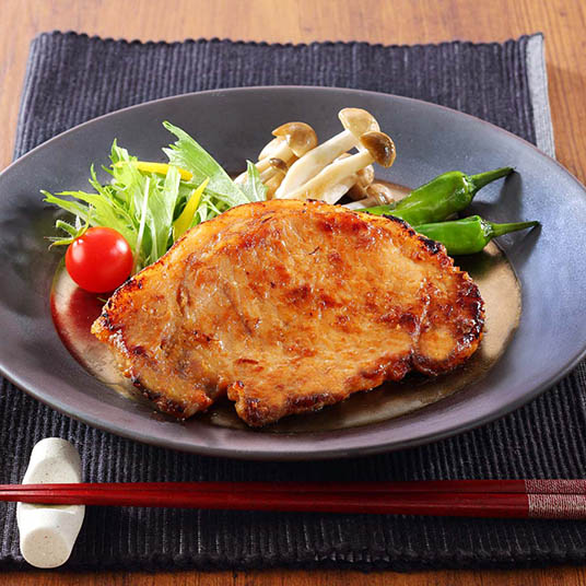 鳥取県産の大山豚のロース肉を西京味噌と金山寺味噌にじっくりと漬け込みました。コクのある甘みと焼き上げた際の香ばしさが一体となり、噛みしめるほどにおいしさが広がります。