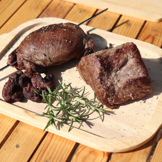 伊賀牛はもも肉でありながらサシも入っており柔らかく、みえジビエ鹿肉は赤身の肉質のため、歯ごたえがありどちらも肉のうまみが味わえるのが特長です。三重県が誇る伊賀牛とみえジビエの鹿肉をご堪能くださいませ。