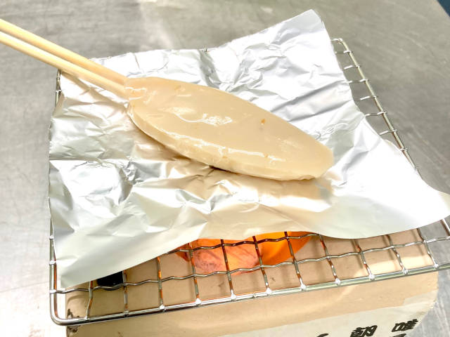 七輪に網を乗せて、アルミホイルを敷き笹かまを乗せて炙ります (ひっくり返しながら表面がきつね色になるまで) ひっくり返すときにアルミホイルがくっつく場合があるので火傷にご注意ください。割り箸などを串としてご使用すると楽しめます。