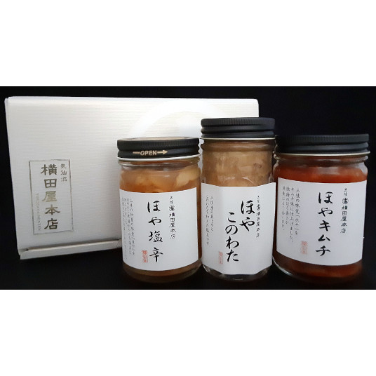 気仙沼の地酒を使用した「ほや塩辛」、ほやとなまこの腸このわたを和えて塩辛にした「ほやこのわた」、とても相性が良いキムチ味に和えた「ほやキムチ」、三陸産の真ほやを使用した人気のほや珍味セットとなります。