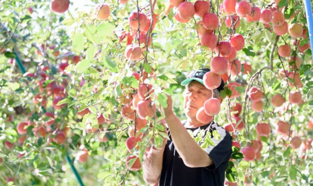 りんご栽培のスタートは、深い雪の中での剪定です。枝一つ一つ見極めておいしいりんごが実るところを選別していきます。春になると花が咲き実が膨らみはじめ摘花摘果作業になります。この作業がその年のりんごが決まる大事な作業です。慎重にかつ大胆な決断が必要になります。実が大きくなるまで観察を欠かさず、収穫が近くなると味見を毎日して美味しくなってるか確認します。そしておいしさの秘密の「葉」の力。光合成の効果を高めるために海藻エキスや木酢液を散布して元気な葉を育てることを意識してます。