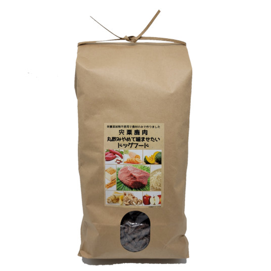 【素材】肉類(鹿肉、鹿内臓肉、鹿骨)、穀類(玄米、おから)、野菜類(南瓜、人参、薩摩芋、バナナ、林檎、椎茸)、ローリエ