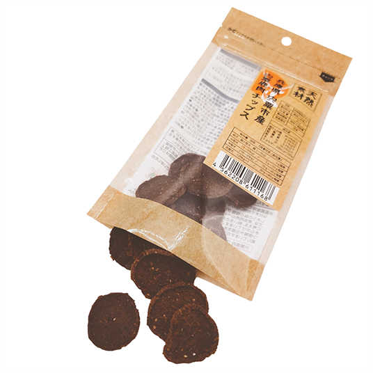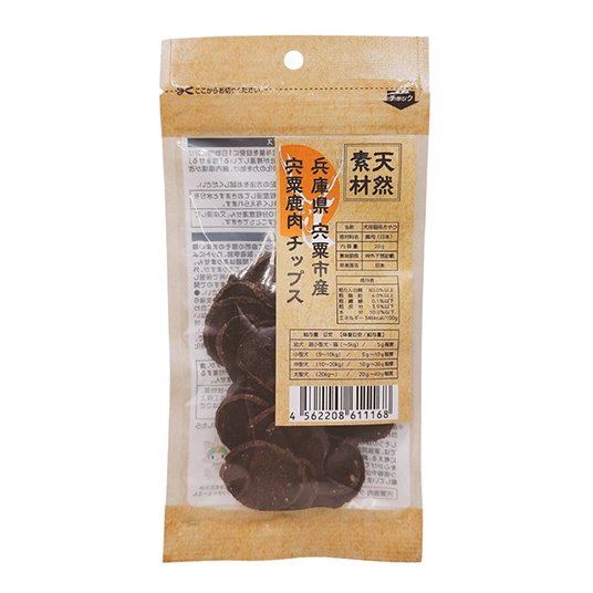 宍粟鹿肉を使用。鹿肉はアレルギーを起こしにくい食材です。自然豊かな宍粟(しそう)市の森で育った良質な鹿肉を使用しています。コイン状のチップスです。