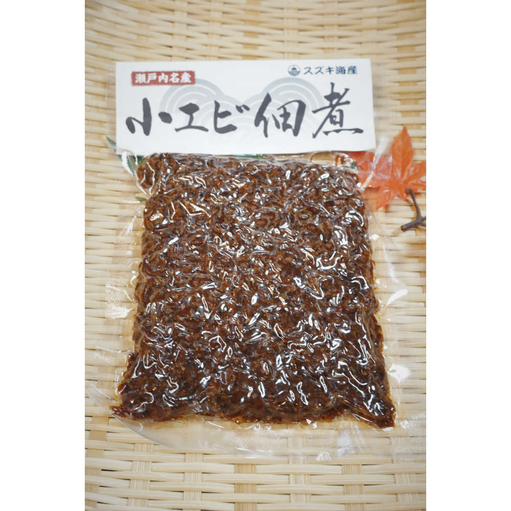 瀬戸内播磨灘で水揚げされたばかりの身が締まったアキアミエビを使用して甘辛く炊き上げています。当社オリジナルの小エビ佃煮は根強いファンが多い商品です。エビは鮮度が命なので、水揚げ後、鮮度が落ちないうちに熱が均等に回る特注の鍋で仕上げています。真空パックにしていますので常温保存が可能です。