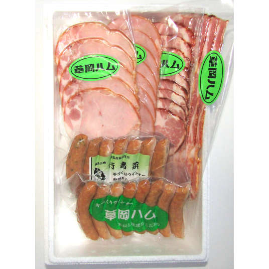 【内容量】ウインナーソーセージ130g、行者菜入りウインナー130g、ロースハムスライス90g、ポークハムスライス90g、ベーコンスライス70g、ショルダーベーコンスライス75g
