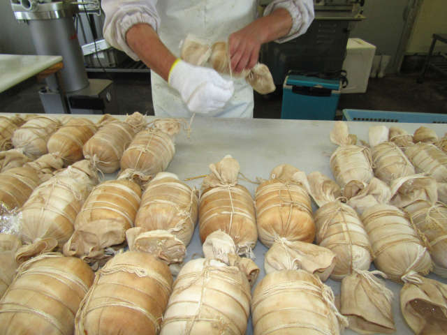 草岡ハムの商品はほとんど手作りで作っています。ロースハムなどは、整形・漬け込み後、晒で巻いて綿糸できっちり縛り一晩じっくり燻煙します。ソーセージは香辛料などと煉り合せた後、ウインナーは羊の腸、フランクフルトは豚の腸に詰めて燻煙します。そのパリっとしてジューシーな食感は、食欲をそそります。