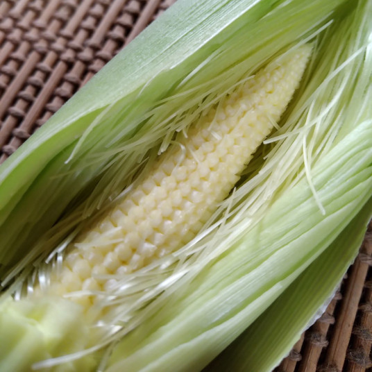 スイートコーンのヤングな姿、ヤングコーン(ベビーコーンとも呼ばれます)。