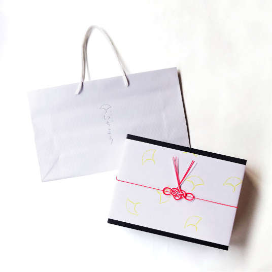 包 装:贈り物としてもご利用いただけるよう、化粧箱におさめて銀杏包装紙・伊予水引でラッピングし、オリジナル紙袋を添えてお届けしています。