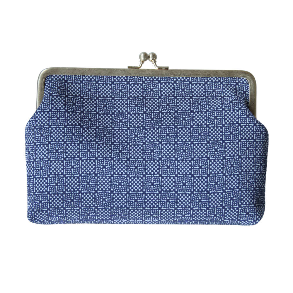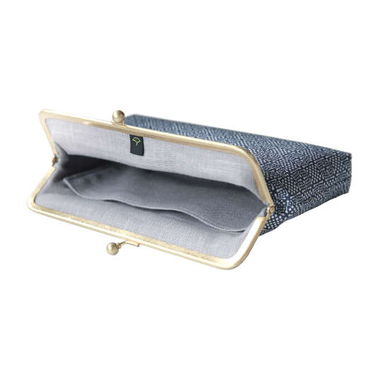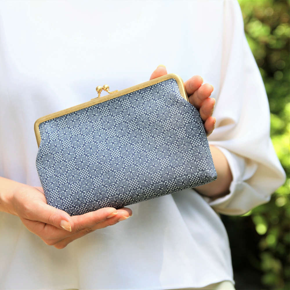 「伊予小紋いちよう」は、江戸時代 武士の裃の模様付けで発展した伝統技法で、小紋師(型染職人)が着物用反物を染める染色工房です。縁起の良い意味や物語が込められた紋様を伝統色で染めて、ちょっとしたお出かけにお使いいただけるクラッチバッグにお仕立てしました。和装洋装問わず、凛とした印象を演出します。