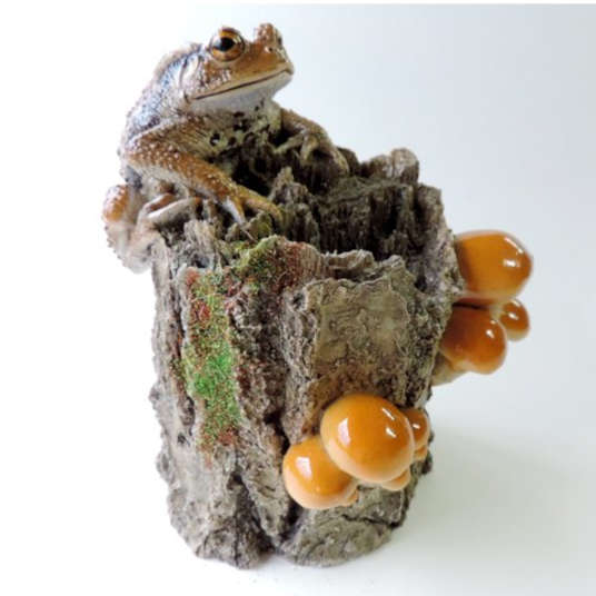 木によじ登っているヒキガエルとぷりぷりナメコの置物です。