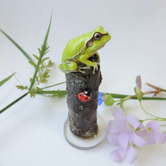 夕暮れ時、明日はどんないいことがあるかな、と思いを馳せるアマガエル。枝にはナナホシテントウがとまって羽を休めています。地衣類も着いてリアルな表現です。