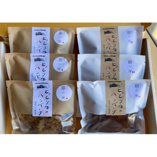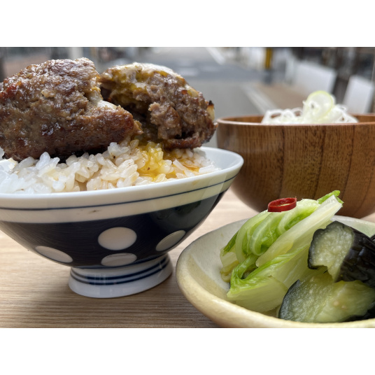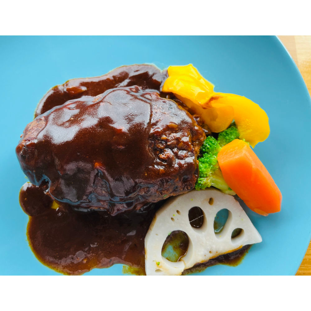 厳選した鳥取牛肉と豚肉を使用し、肉本来の旨味を引き出すために、岩塩を加え一晩寝かせた後にじっくりと調理しています。デミグラスソースと和風ソース、それぞれの特徴を活かした風味が楽しめる特別なセットです。健康を気遣う方にも嬉しい、鳥取県大山町産の蕎麦の実をつなぎに使っており、消化を助ける効果が期待できます。