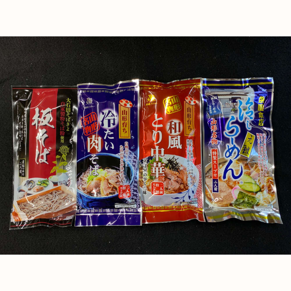 【内容量】山形育ち冷たい肉そば(干しそば90gx2、特製スープ53gx2)x2袋、栄屋本店元祖冷しらーめん(干し中華めん100gx2、特製スープ75.2gx2)x2袋、山形育ち和風とり中華(干し中華めん90gx2、特製スープ46gx2)x2袋、大石田そばきよ板そば(干しそば200gx2、つゆ25gx2)x2袋