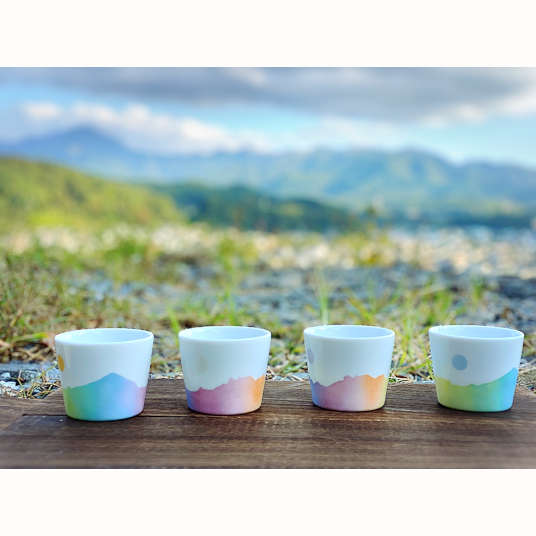 長野県佐久穂町"yamania"の工房のある和やか(にこやか)の山からの眺めを絵付けしたフリーカップ4個セットです。