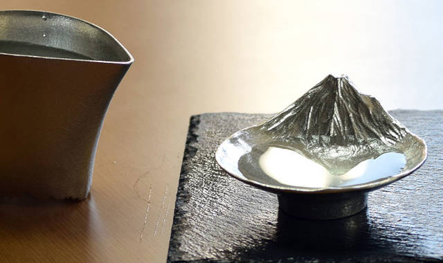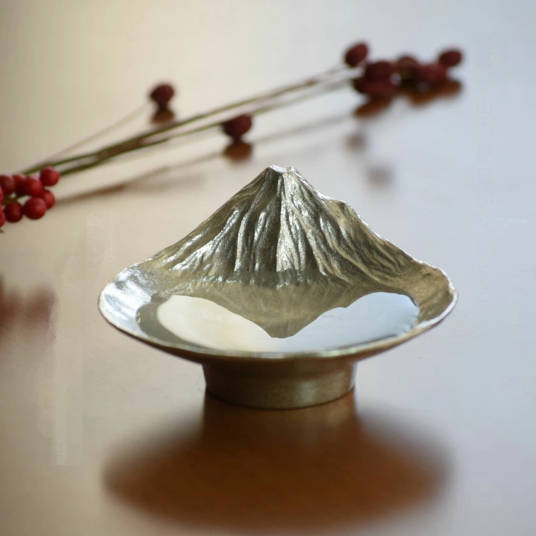 富士山の絶景が楽しめる錫製さかさ富士盃。鋳物の街として400年以上の歴史がある富山県高岡市で造られた酒器、職人の手作業で1点1点生まれてくる金属鋳物特有の風合いとなっています。満水容量60ml。