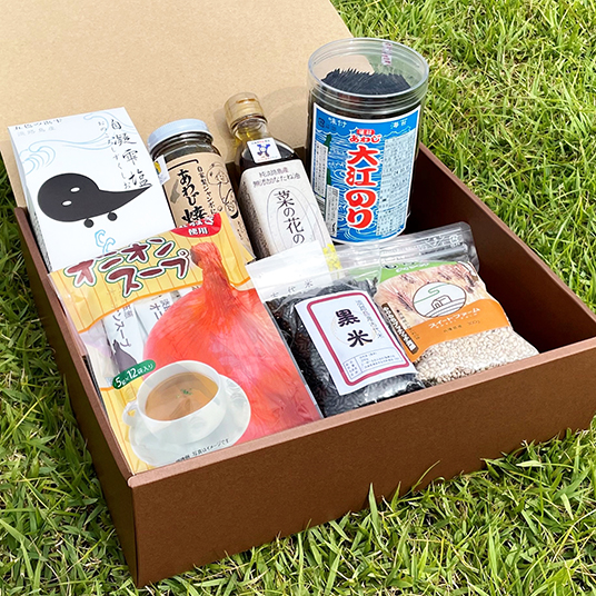 【内容量】自凝雫塩(155g×1箱)、なたね油(180g×1本)、あわじ焼き肉のたれ(甘口 200ml× 1瓶)、淡路島オニオンスープ(5g×12袋入り)、あわじ大江のり(48枚入×1パック) 、もち麦(ダイシモチ300g )、古代米(黒米 200g)