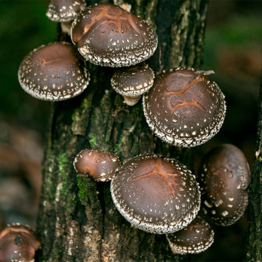 原木しいたけは伐採から2年の歳月をへてようやく収穫が始まります。自然に近い環境で栽培されるしいたけは天然もののしいたけに引けを取らないおいしさです。艶のある茶褐色で色味もよく、肉厚で風味や香りにも優れています。コリコリとした食感はまるで「山のあわび」のよう。秋からの数カ月にだけ収穫される、一番おいしい原木しいたけです。