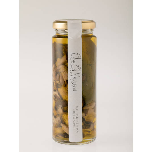 『原木しいたけのオリーブオイルマリネ』は熊本県菊池渓谷の美しい水と豊かな緑のもとで栽培した原木しいたけを使ったオリジナルのビン詰め商品です。うまみたっぷりのしいたけを瓶の中にぎゅっと詰め込みました。プリッとした原木しいたけをスパイシーで香り高いオリーブオイルマリネに仕上げました。しいたけの香りいっぱいのオイルもパスタやリゾット、ドレッシングにお使いいただくことができます。