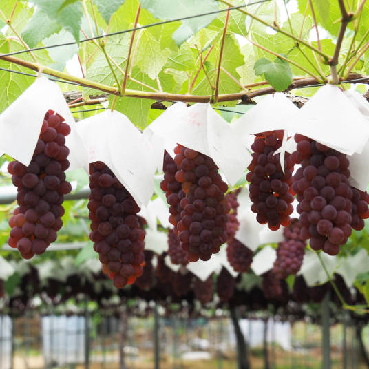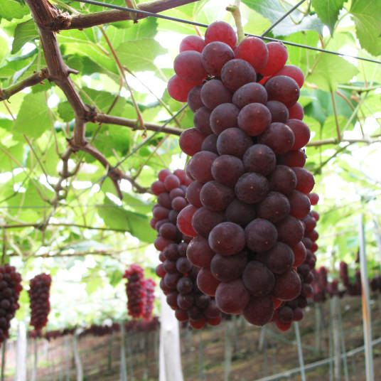ぶどうづくりの主な作業としては、①雪解けから始まる雨よけのビニール張り ②房を間引く手作業 ③生育促進と種無しぶどうにするためのジベレリン作業 ④形の良い房にするための房づくり作業 ⑤粒づきをちょうどよく仕上げるための粒抜き作業 ⑥じゅうぶん色付きしたらようやく収穫となります。作業のほとんどが、一房単位・一粒単位で行われる作業で、その他にも園地の管理など細かな作業があり、毎年の無事の実りのために丁寧に頑張っております。栽培農家直送のぶどうですので鮮度・品質ともに自信をもってお届けいたします。
