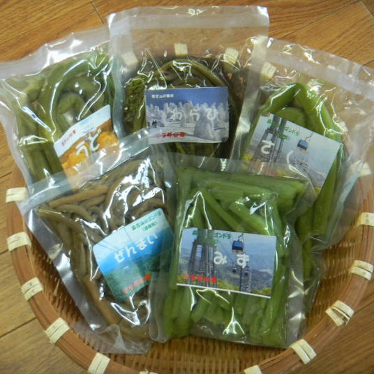 【素材】秋田県産 わらび、うど、みず、さく、あざみのとう/乳酸Ca,酸化防止剤(ビタミンC),リン酸塩(Na)酸味料、着色料(銅葉緑素)