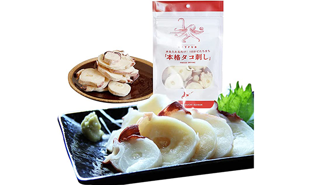 北海道産の水タコを使用しています。フリーズドライ加工を施し水を注ぐだけで簡単に本格タコ刺しが味わえます。