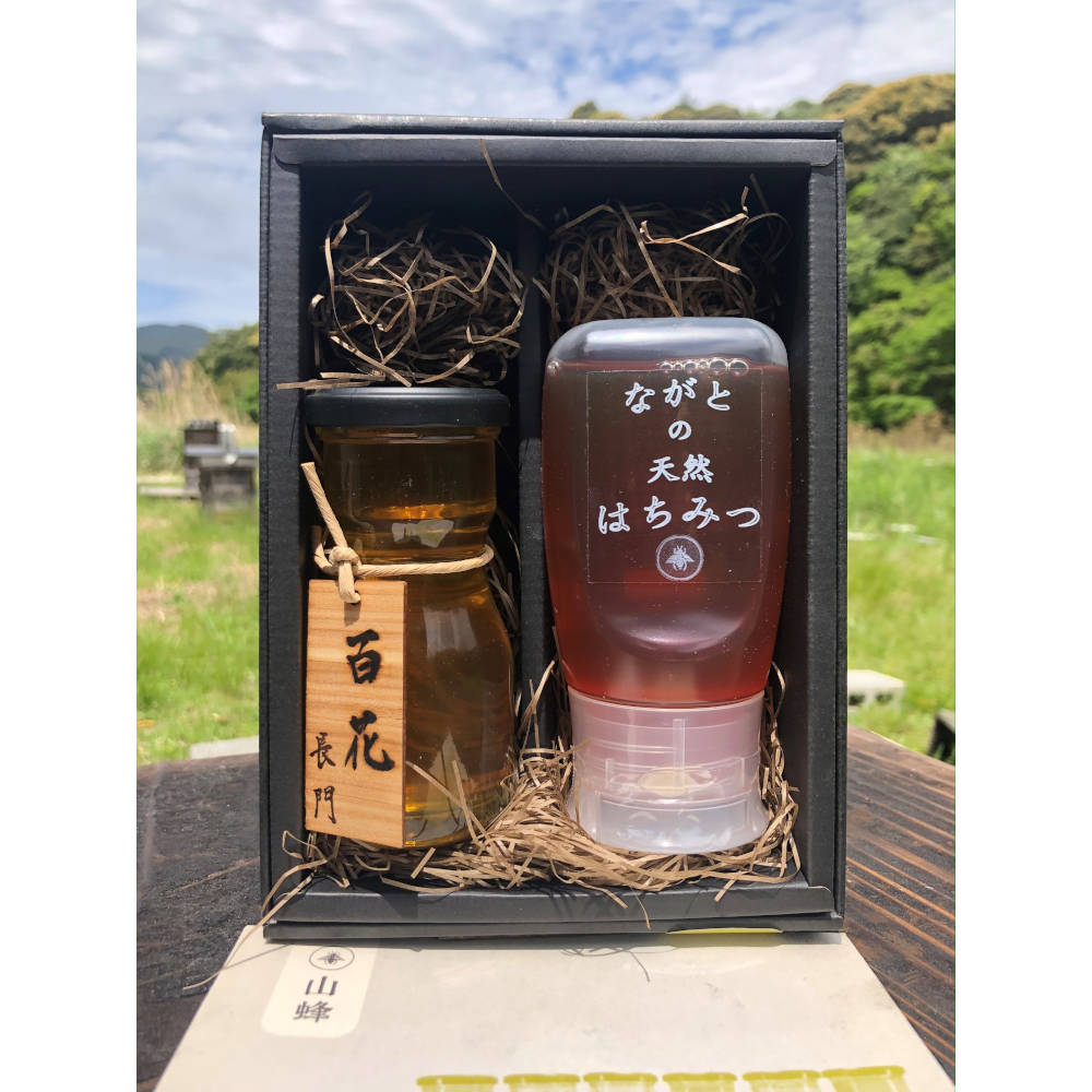 孫農園のこだわり生産の蜂蜜 「百花」 と、食べやすく使いやすい容器が大人気のブレンド蜜 「ながとの天然はちみつ」 が2本セットになっています。ご自宅での普段使いや、手土産や贈り物などのお遣い物や、海へ山へ川へアウトドアのお供にも、どのようなシチュエーションや場所にもお喜び頂ける蜂蜜のセットです。