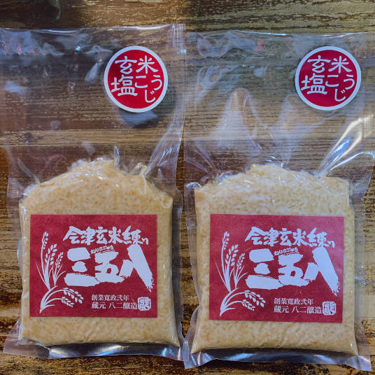 三五八とは、福島県会津地方に昔から伝わる一夜漬けの素です。塩が三、糀が五、米が八の割合でそれらを混ぜ合わせ、じっくりと熟成させたことから「三五八」と呼ばれています。会津玄米練り三五八は、玄米の栄養を手軽に摂って欲しいとの想いから「玄米×発酵」をテーマに、会津産玄米を使用して作った玄米の三五八です。