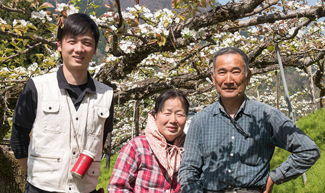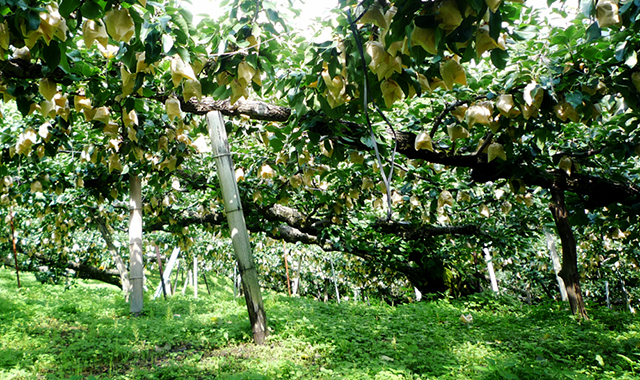 昭和23年より栽培しており3代目になります。鳥取県の名産「二十世紀梨」を中心に新甘泉、王秋などさまざまな梨の品種にも挑戦しています。水資源が豊富にある地域で非常にみずみずしい梨が育ちます。伝統的な栽培方法を伝承しつつ新しい栽培方法も行なっています。その他にも長年除草剤を使わず、草刈機で除草してます。有機物は廃菌床など取り入れて土作りを行なうだけでなく、土壌も分析してよりよい土壌になるように観察しています。