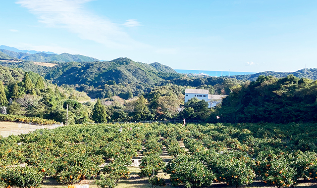 「年中みかんのとれる町」として有名な三重県御浜町。くまのグリーンファームは、熊野灘を見下ろす熊野古道に囲まれた土地にあります。黒潮のもたらす温暖な気候、降り注ぐ太陽の光、穏やかな潮風と適度な雨は柑橘類をはじめとするさまざまな果物の栽培に最適です。この恵まれた環境の中で、私たちは人と自然と動物が共存協業する循環型の農業を目指して日々勉強中です。