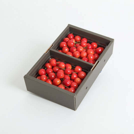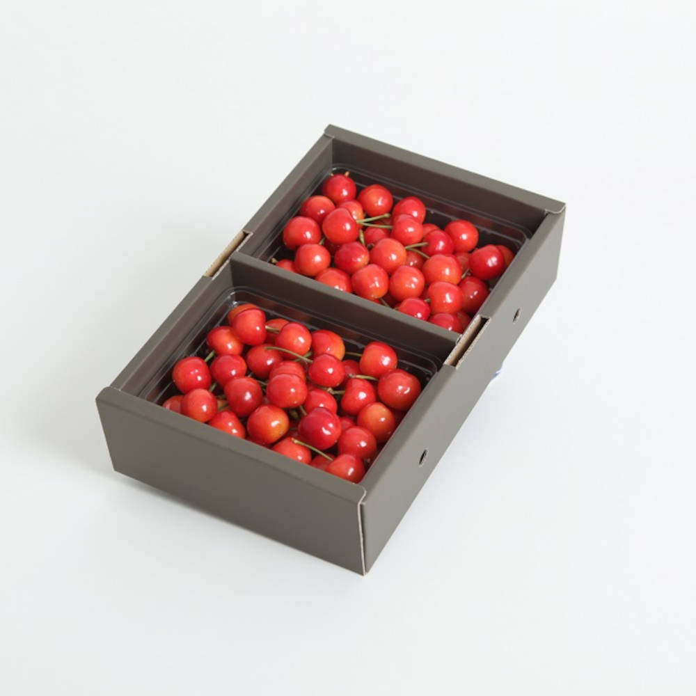 さくらんぼはデリケートな果物です。選果の時に問題がなくとも収穫時の圧力による傷みは時間とともに滲み黒ずみが出てきます。それを限りなくゼロにするため梱包直前に全方向から再検品しています。