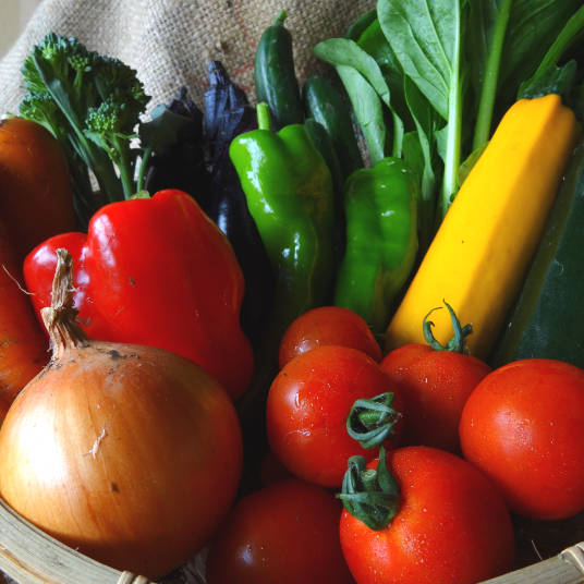 【内容量】玉ねぎ750g、じゃがいも750g、なす400g、ピーマン350g、ミニトマト200g、ほうれん草200g、小松菜200g、スナップエンドウ200g、レタス1個、かぶ4玉(一例です。その時に採れる旬の野菜が10種類前後入っています。
