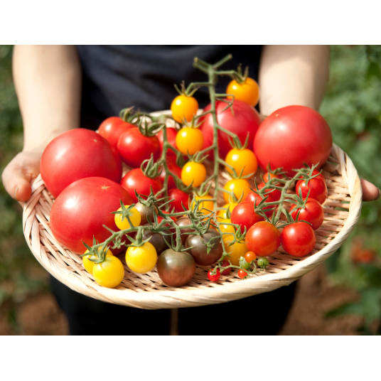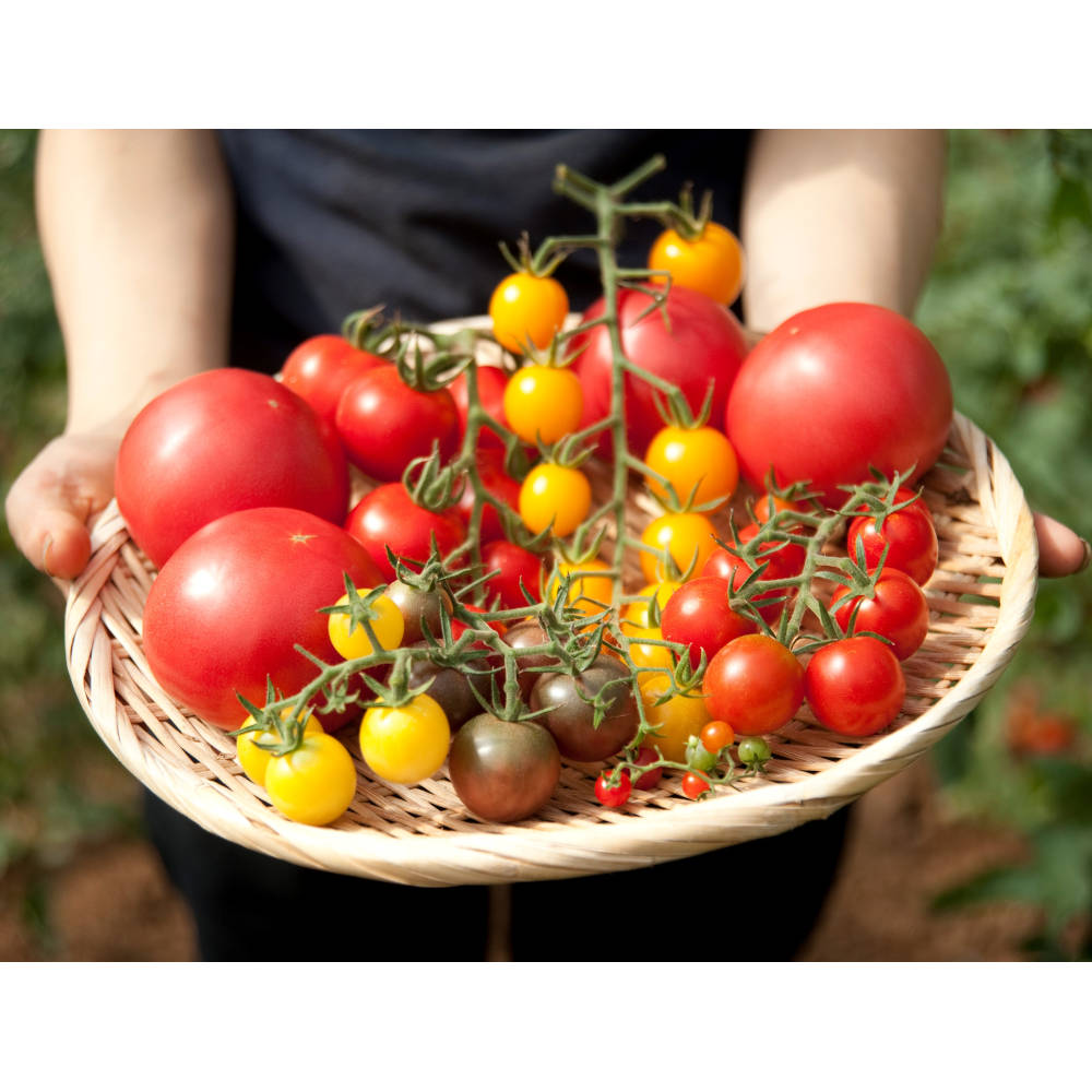 夏が旬の大玉トマトを1kg、中玉トマトとミニトマトの詰め合わせ1kgをセットにしてお届けします。食べ頃の実を収穫しますので時期によって内容の品種の数に偏りがあります。