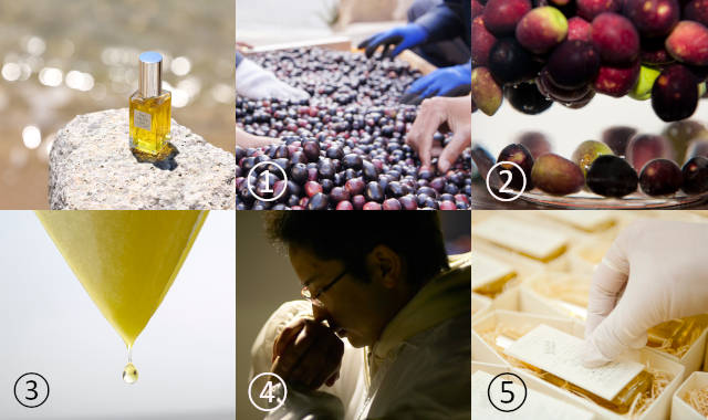 ①収穫・選果:手摘みで収穫したオリーブの果実を手作業で選果 →②熟成:独自技術「乳酸微発酵」で果実を発酵 →③搾油・自然ろ過:搾油後はろ紙で時間をかけて一滴ずつろ過 →④官能検査:搾油マイスターの資格を持つスタッフと品質管理責任者が、五感を使って「香り」「色」「使用感」を厳しくチェック →⑤仕上げ:一瓶ずつ手作業で瓶詰めし、数量限定生産の証であるエディションナンバーを一箱一箱にいれていきます。