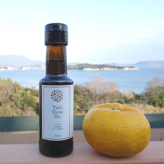 土庄町で収穫されたオリーブの果実と「黄金の村」のゆずの果皮を一緒に搾った、香り高いオリーブオイルです。