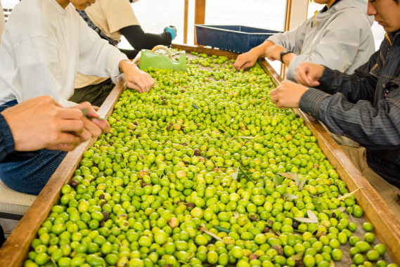 使用の小豆島産のオリーブ果実はすべて手摘みで収穫。その後、傷のある果実や病気のある果実を目視で丁寧に選別いたします。収穫、選別された果実は翌日には搾油されます。収穫・選別・搾油までの工程が短く、丁寧なことが小豆島産エキストラバージンオリーブオイルの品質の高さと美味しさの特徴です。