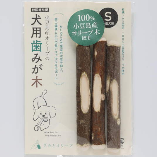 有機JAS 認証の畑で育てた小豆島産100%オリーブ木を使用した犬用歯みが木。かじることで歯垢の沈着を抑え、わんちゃんの歯の健康とお口の臭いスッキリをサポートします。